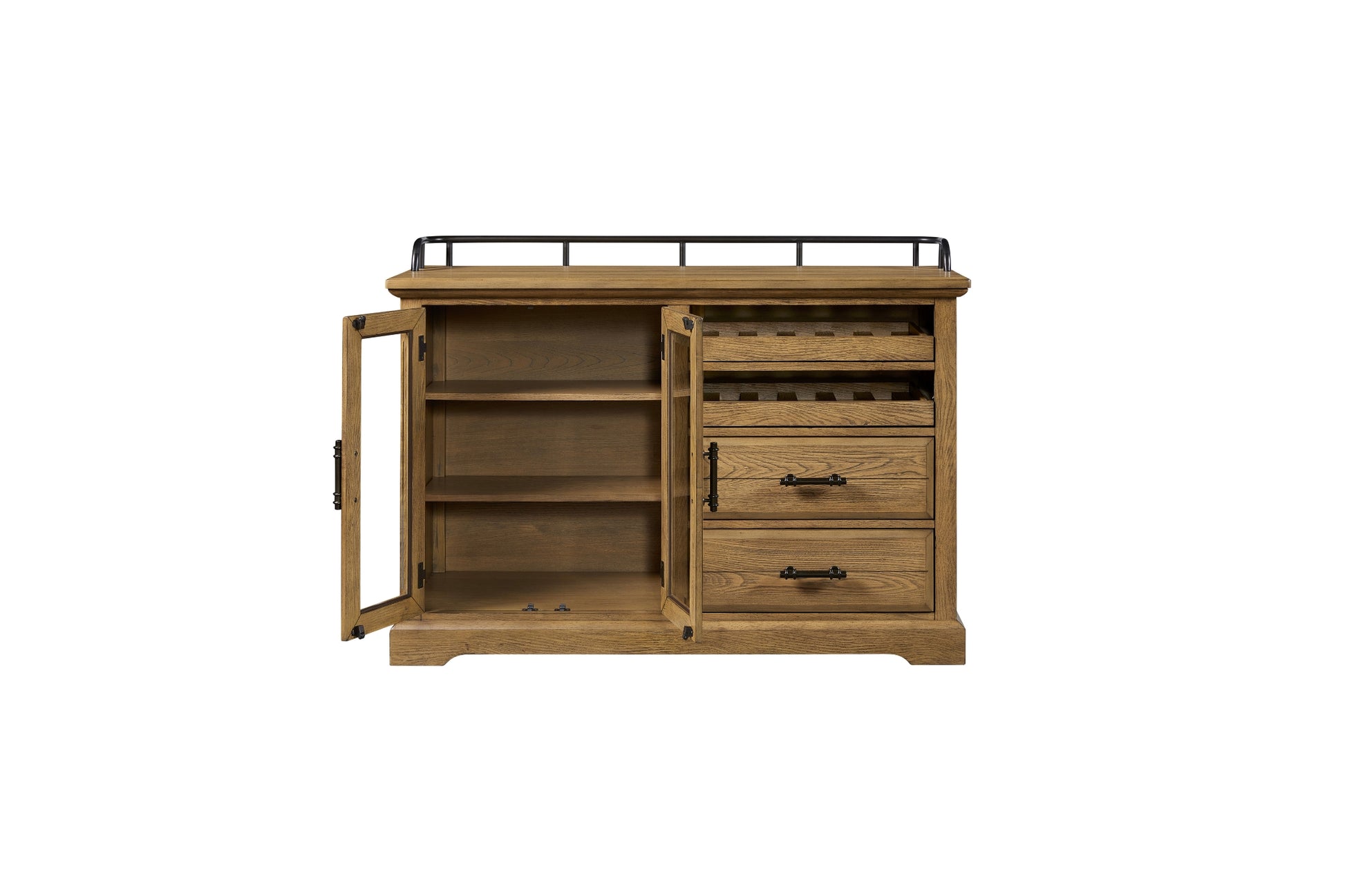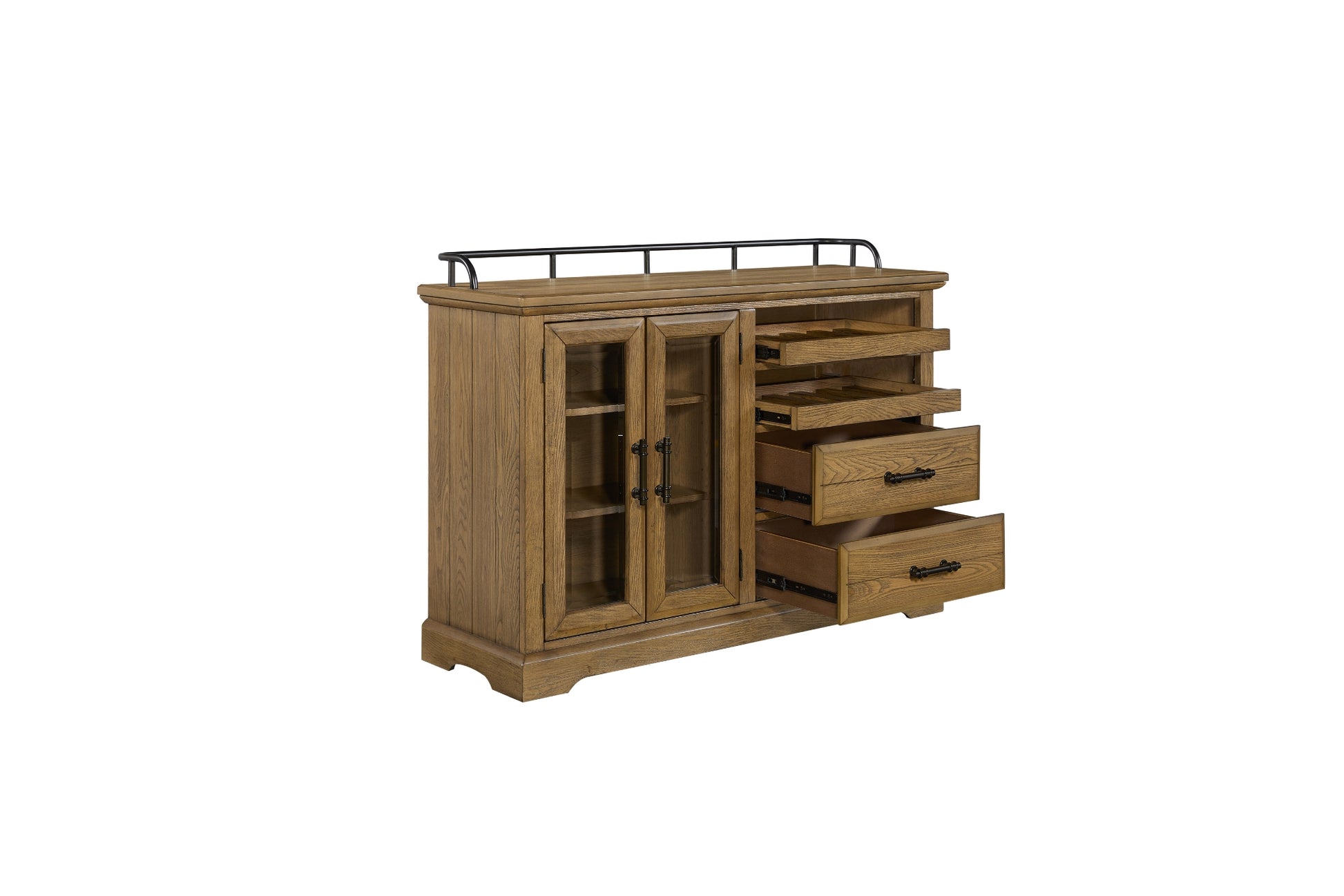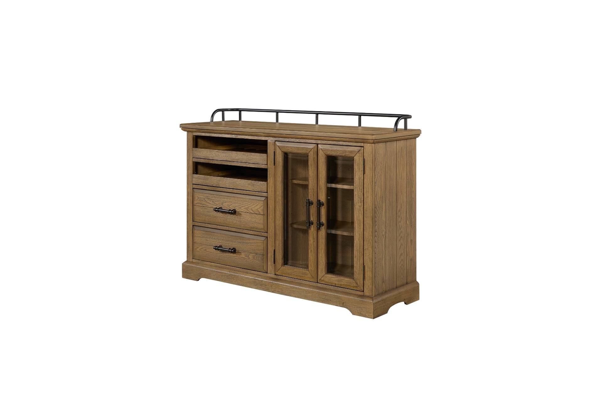 The Bellamy Lane Caramel Server blends timeless craftsmanship with practical, family-friendly function. Finished in a warm Caramel tone that highlights the wood’s natural character, it features a mix of open shelving, glass-front cabinets, and spacious drawers for versatile storage. Subtle metal hardware adds a touch of contrast, while the sturdy frame provides long-lasting durability. Whether used for dining essentials, décor display, or everyday organization, this server brings elevated charm and reliable convenience to your home.